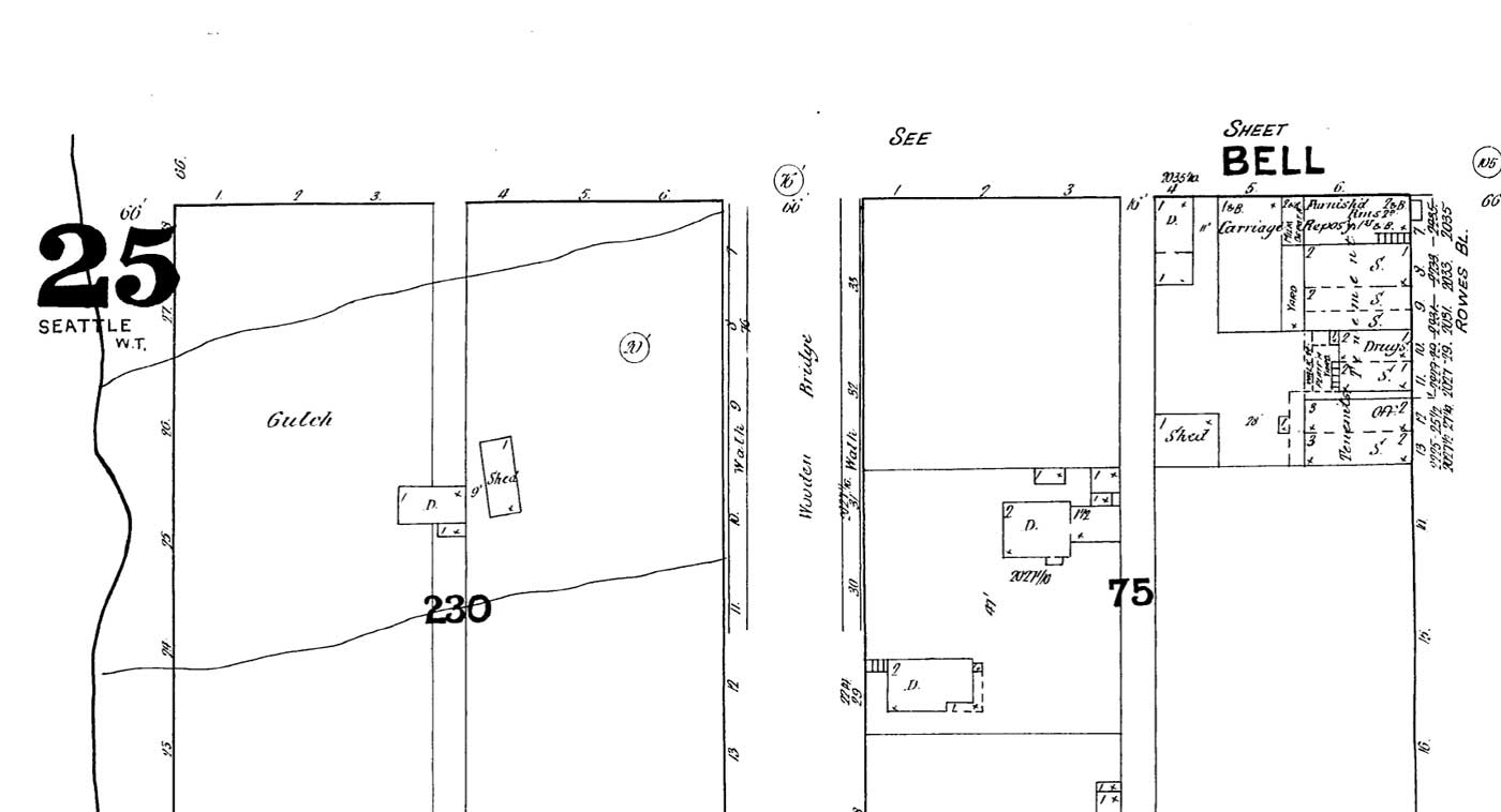 The 1888 Sanborn Real Estate map reveals the industry of Rowe with his row at the southwest corner of Bell Street and First Avenue. Behind his commercial corner to the west the map show some topographical lines for the Belltown Ravine aka Gulch. It was an oddity for the Seattle waterfront that is now long since completely filled in.