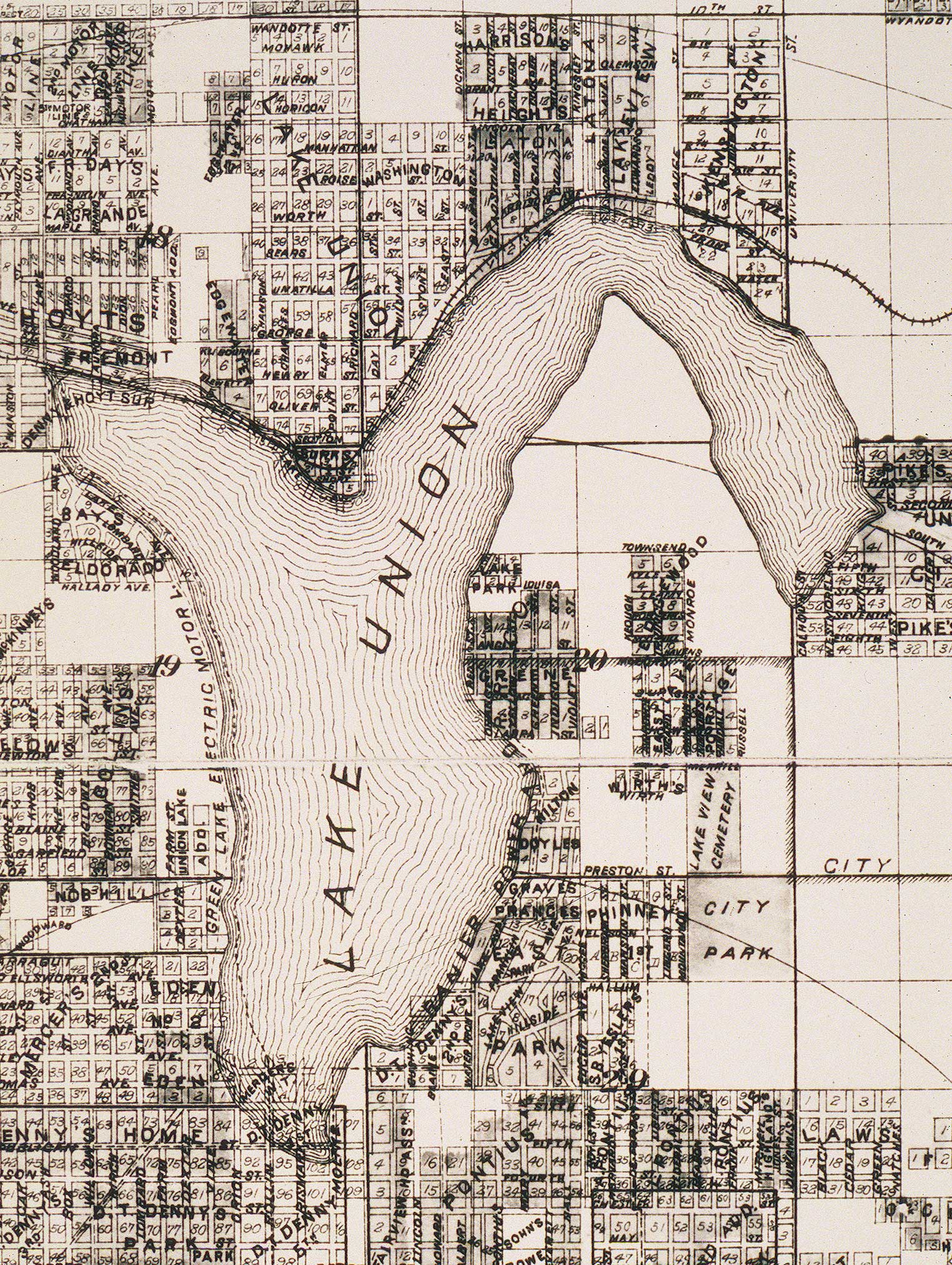 An 1889 real estate map that represent the hopes of developers. Note, upper right, that the Brooklyn Addition (University District) has an earlier addition name, Kensington, and a gride that offer blocks that stretch east-west rather than north-south, which the Brooklyn addition established later that year. Note Fremond and Edgewater and much else. And compare this speculation with what follows: a 1894 map that attempts to show “real roads” and even small squares marking the development of structures – real ones.