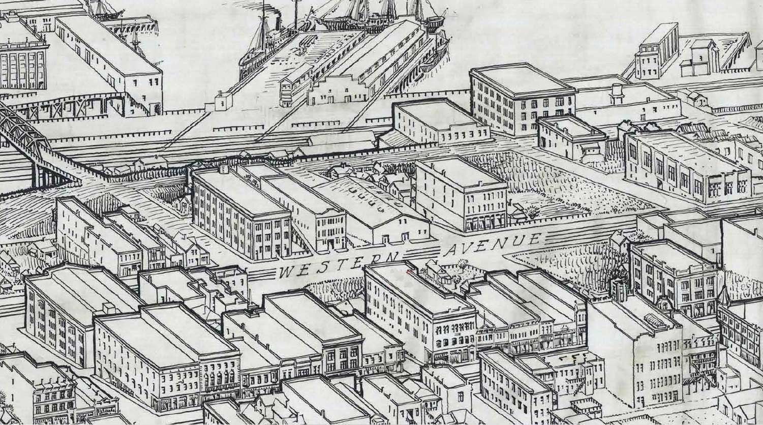 A detail from a 1917 birdseye of the “new retail district” and also of part of Belltown, inclcudes, center-bottom, the southwest corner of First Ave. and Bell Street, showing the unique box-window on hanging at the second window above the sidewalk at the corner.